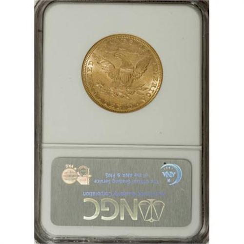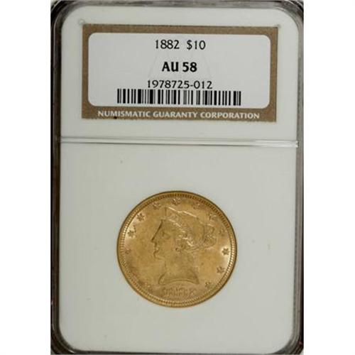 <B>1882 $10 AU58 NGC.</B></I> NGC Census: (249/8363). PCGS Population (317/4383). Mintage: 2,324,480. Numismedia Wsl. Price for NGC/PCGS coin in AU58: $360. (#8695)<BR><BR><B>Coin Engraver:</B> Christian Gobrecht<BR><BR><b>Shipping:</b> Coins & Currency (<a target="_blank" href="http://www.heritageauctions.com/common/shipping.php">view shipping information</a>)