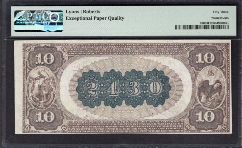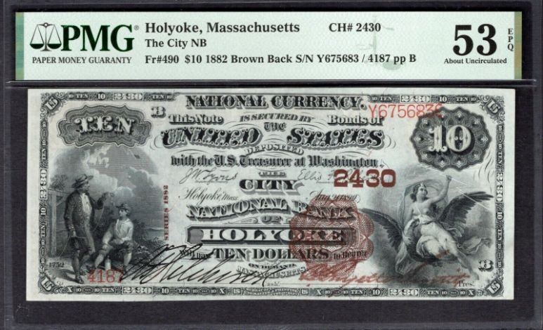 One 1882 $10 Holyoke MA National PMG 53EPQ.