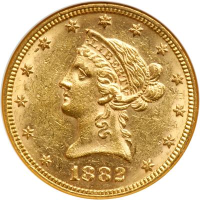 1882 $10 Liberty. NGC graded AU-58. Nice untoned coin (PCGS # 8695) .