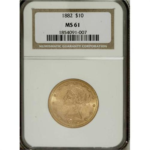 <B>1882 $10 MS61 NGC.</B></I> NGC Census: (3895/3238). PCGS Population (1727/1636). Mintage: 2,324,480. Numismedia Wsl. Price: $380. (#8695)<BR><BR><B>Coin Engraver:</B> Christian Gobrecht<BR><BR><b>Shipping:</b> Coins & Currency (<a target="_blank" href="http://www.heritageauctions.com/common/shipping.php">view shipping information</a>\)