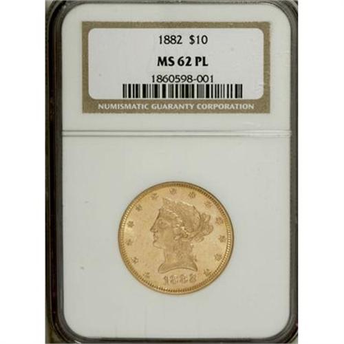 <B>1882 $10 MS62 Prooflike NGC.</B></I> The reflective fields exhibit moderate marks consistent with the grade. A boldly struck example of an issue available in Mint State, but very scarce with prooflike surfaces. Census: 8 in 62 Prooflike, 1 finer (5/07).<BR><I>From The Vanek Collection.</B></I><BR><BR><b>Shipping:</b> Coins & Currency (<a target="_blank" href="http://www.heritageauctions.com/common/shipping.php">view shipping information</a>)