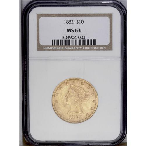 <B>1882<$10> MS63 NGC.</B></I> A lustrous and penetratingly struck representative with moderate field grazes and an overall attractive appearance.