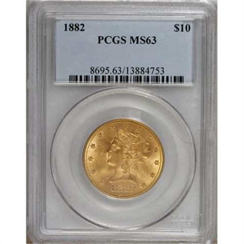 <B>1882 $10 MS63 PCGS.</B></I> This Select Mint State representative is a wonderful piece with highly lustrous yellow-gold surfaces that are enhanced by traces of pink and olive toning. A condition rarity, PCGS has only certified 27 finer pieces (6/07).<BR><BR><b>Shipping:</b> Coins & Currency (<a target="_blank" href="http://www.heritageauctions.com/common/shipping.php">view shipping information</a>)