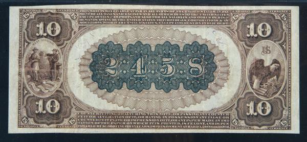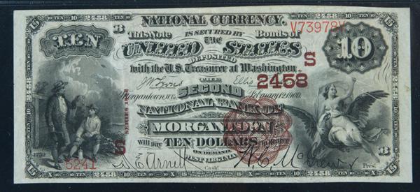 1882, $10 National Bank Note. The Second National Bank of Morgantown, West Virginia. . Fr-490. This Brown Back contains the autographed signatures of Lyons and Roberts. Morgantown is a city in Monongalia County, West Virginia. Zackquill Morgan settled the area about 1772 by establishing a homestead near present-day Fayette Street and University Avenue. Morgan fought in both the French and Indian War and the American Revolutionary War, rising to the rank of colonel. PMG graded VF-30 Exceptional Paper Quality.