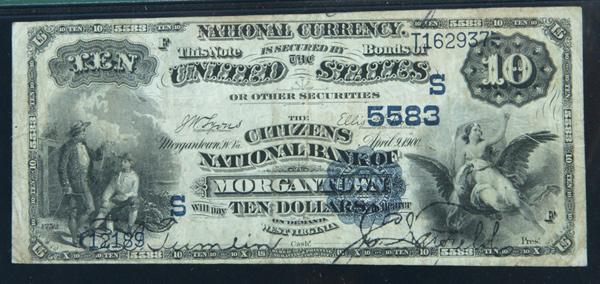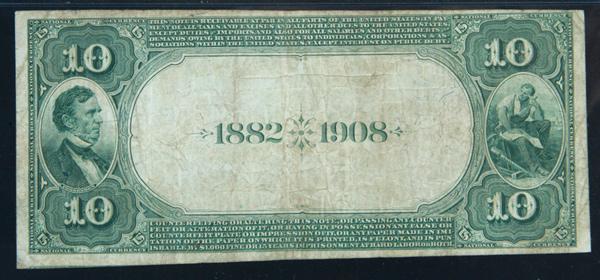 1882, $10 National Bank Note. . Fr-545. This Date Back issue has the stamped signatures of Lyons and Roberts. Only 3 large size notes are known from this bank . PMG graded Fine-15.