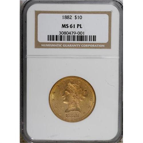 <B>1882 $10 Prooflike MS61 NGC.</B></I> NGC Census: (5/9). PCGS Population (0/0). Mintage: 2,324,480. (#78695)<BR><BR><B>Coin Engraver:</B> Christian Gobrecht<BR><BR><b>Shipping:</b> Coins & Currency (<a target="_blank" href="http://www.heritageauctions.com/common/shipping.php">view shipping information</a>\)