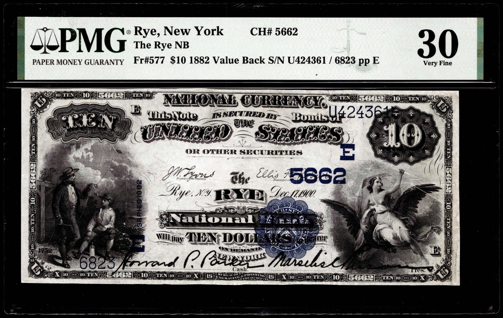 1882 $10 The Rye NB Rye, New York CH# 5662 National Currency Note PMG Very Fine 30