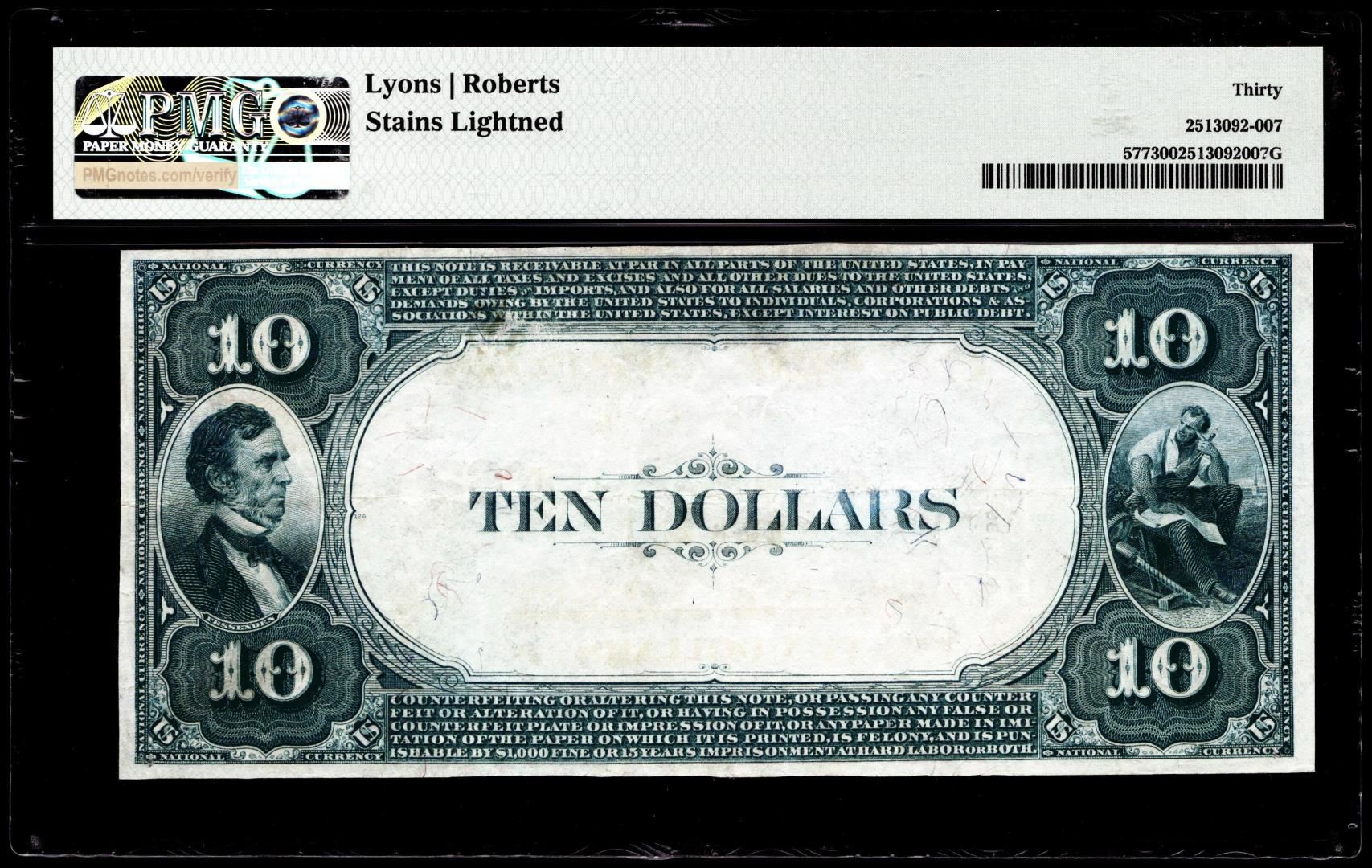 One 1882 $10 The Rye NB Rye, New York CH# 5662 National Currency Note PMG Very Fine 30. PMG Certified.