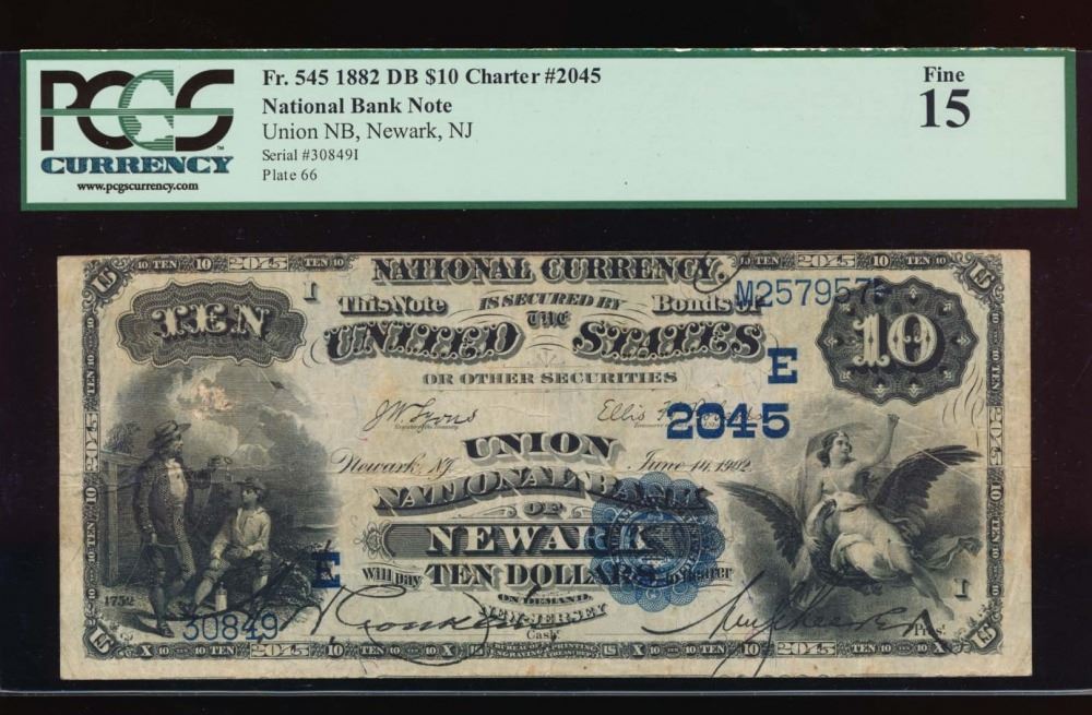One 1882 $10 Union National Bank of Newark Note PCGS 15.