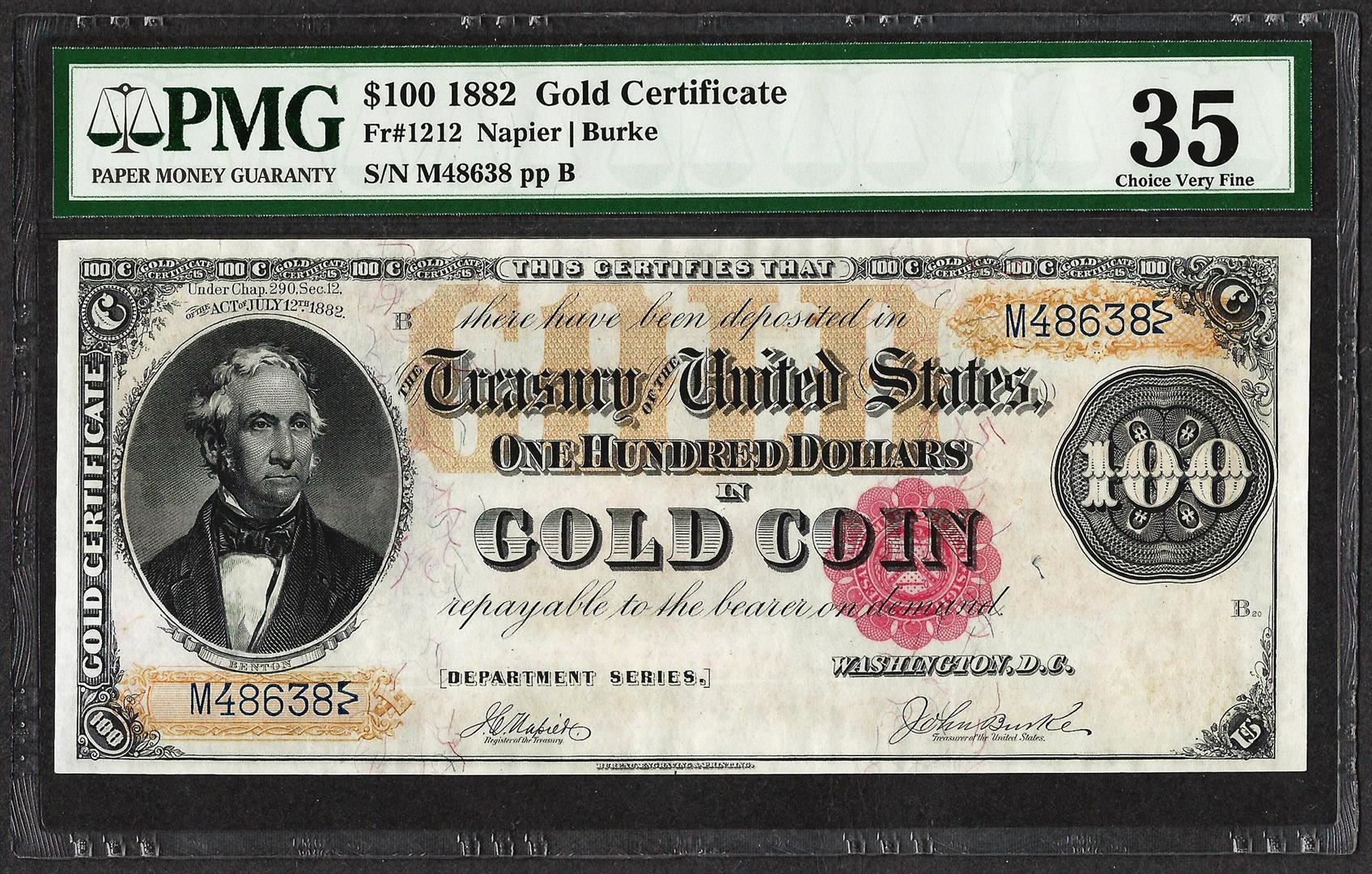 One 1882 $100 Gold Certificate Note Fr.1212 PMG Choice Very Fine 35. PMG Certified.