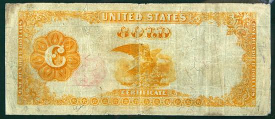 1882, $100 Gold Certificate. PCGS Apparent Fine 15. . Fr-1206. There are some minor edge splits and the edges are also fraying slightly, as noted by PCGS Currency, but this is a much scarcer Fr. number with only about three dozen pieces recorded in the most recent census data.