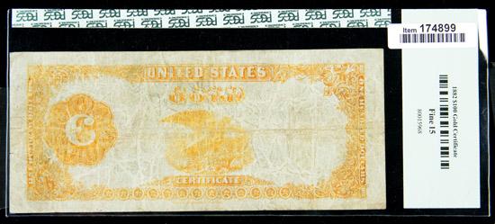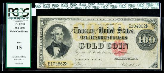 1882, $100 Gold Certificate. PCGS Fine 15. . Fr-1208. This is a much scarcer Fr. number, with PCGS Currency having graded just four notes in all grades, the finest a pair of VF25s. This bold example displays vibrant colors despite some modest circulation.