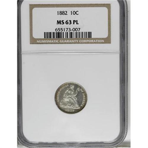 <B>1882 10C MS63 Prooflike NGC.</B></I> PCGS Population (66/191). NGC Census: (53/223). Mintage: 3,910,000. Numismedia Wsl. Price for NGC/PCGS coin in MS63: $275. (#4690)<BR><BR><B>Coin Engraver:</B> Christian Gobrecht<BR><BR><b>Shipping:</b> Coins & Currency (<a target="_blank" href="http://www.heritageauctions.com/common/shipping.php">view shipping information</a>)