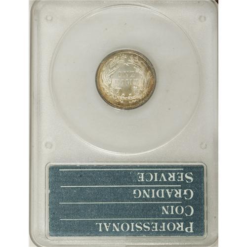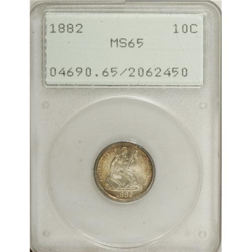 <B>1882 10C MS65 PCGS.</B></I> Golden-brown and apple-green endow the borders of this sharply struck and beautifully preserved Gem. The centers are lightly toned. Mintage of dimes recovered in 1882 after three years of minimal production, due to the need to coin silver dollars. Encapsulated in a first generation holder.<BR><BR><b>Shipping:</b> Coins & Currency (<a target="_blank" href="http://www.heritageauctions.com/common/shipping.php">view shipping information</a>)