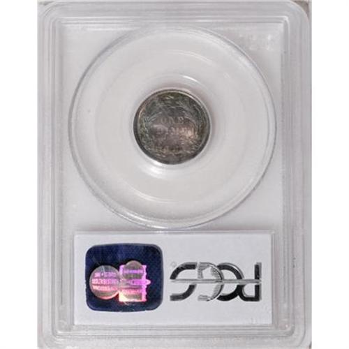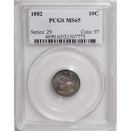 <B>1882 10C MS65 PCGS.</B></I> Great luster blossoms through light blue patination that has admixtures of rose coloration in the centers. The design features are well struck up, and just one minute mark is noted, to the left of Liberty's head. <BR><BR><B>Coin Engraver:</B> Christian Gobrecht<BR><BR><b>Shipping:</b> Coins & Currency (<a target="_blank" href="http://www.heritageauctions.com/common/shipping.php">view shipping information</a>)