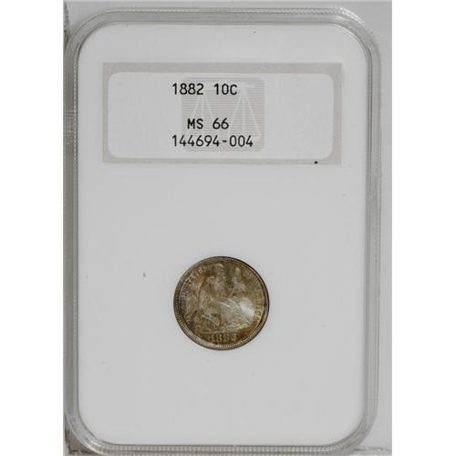 <B>1882<10C> MS66 NGC.</B></I> This attractive coin has variegated toning with lavender and golden-brown as the major colors. Sharply struck with great luster. Census: 35 in 66, 26 finer (7/06).<BR><I>From The Antigo Collection.</B></I>
