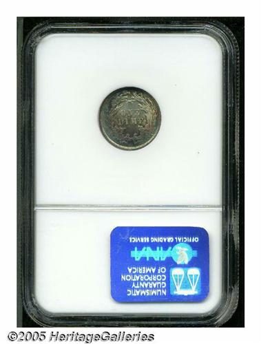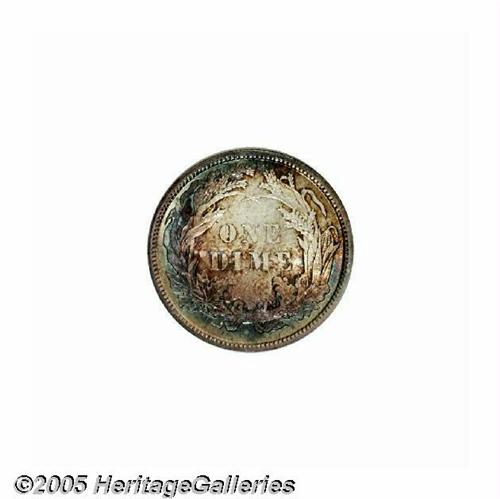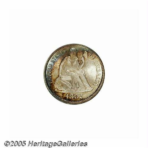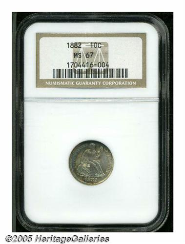 <B>1882<10C> MS67 NGC.</B></I> In 1882 the production of Seated dimes once again climbed to large numbers after three low mintage years following passage of the Bland-Allison Act. However, very few Superb examples were set aside even though 3.9 million pieces were struck. This is an especially pleasing coin that exhibits strong mint luster. The centers of each side are nearly untoned and the margins are surrounded by golden and cobalt-blue patination. Strongly struck throughout. Population: 23 in 67, 2 finer (6/05).