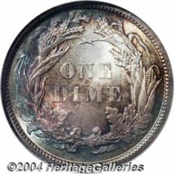 <table><tr><td><table><tr><td>1882 10C MS67 NGC. In 1882 the production of Seated dimes once again climbed to large numbers after three low mintage years following passage of the Bland-Allison Act. However, very few Superb examples were set aside even though 3.9 million pieces were struck. This is an especially pleasing coin that exhibits strong mint luster. The centers of each side are nearly untoned and the margins are surrounded by golden and cobalt-blue patination. Strongly struck throughout. Population: 20 in 67, 2 finer (3/04). <BR><BR><B>Important notice:</B> Heritage usually auctions material at the rate of 200-250 lots per hour. On some occasions eBay Live bid software or the Internet may not be able to keep up with the pace of the auction. We recommend placing a realistic absentee bid now as insurance to avoid disappointment. Occasionally the auctioneer may eliminate or reject an eBay Live bid, and the auctioneer may also reopen a lot after the close of the eBay live bidding (usually because we missed an audience bid), and may reject your bid even if it shows you as the winning bidder. By bidding via eBay Live, you agree that Heritage may award the lot to another bidder at its sole discretion under the circumstances described above or any other reasonable circumstances. Since eBay bids are not shown to us until we open the lot on the floor, we treat those bids just like floor bids. In most cases the floor responds before the eBay bid is presented to us, due to Internet lag time, so for consistency we have made it a policy that floor bids are always considered first over tie eBay live bids. Also please note that all Heritage lots purchased through eBay Live carry a 20% Buyer's Premium. Please make sure you read the Terms and Conditions before you bid. <BR><BR><B>IMPORTANT ANNOUNCEMENT ABOUT RESERVES:</B> Heritage now divulges all reserves on its web site 7 days before every auction. If you want to know whether the reserve on this lot has been met, and if not, what the reserve amount is, please visit this lot page on the HeritageCoin.com web site, or email: bid@HeritageGalleries.com </span></font></td></tr></table></td></tr></table>