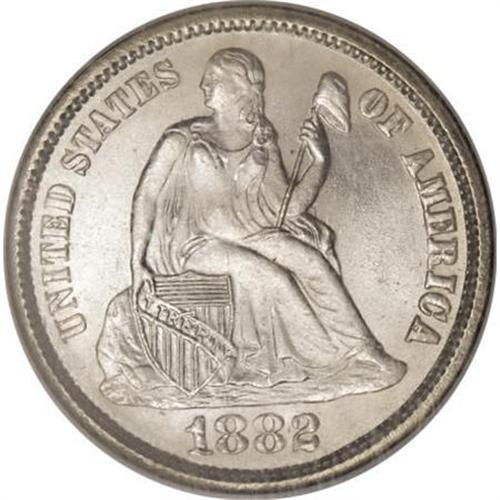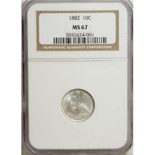 <B>1882 10C MS67 NGC.</B></I> Although the Philadelphia mint ratcheted up production of Seated dimes to more than 3.9 million pieces in 1882 and hundreds of pieces were subsequently spared from circulation, the presently offered Superb Gem is still a coin of outstanding quality. Both sides display an intense satiny-white sheen and only a few modest signs of contact can be noticed on the obverse. Census: 25 in 67, 2 finer (6/07). <BR><BR><B>Coin Engraver:</B> Christian Gobrecht<BR><BR><b>Shipping:</b> Coins & Currency (<a target="_blank" href="http://www.heritageauctions.com/common/shipping.php">view shipping information</a>\)