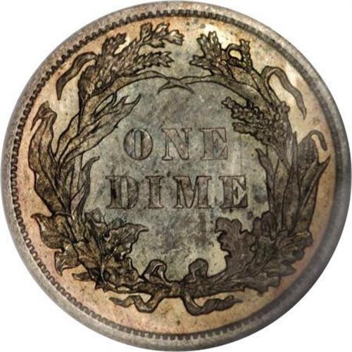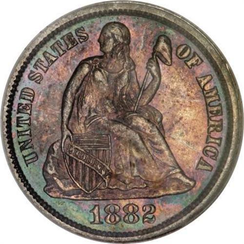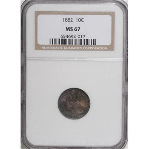<B>1882 10C MS67 NGC.</B></I> Satiny luster shimmers beneath an overlay of warm gunmetal gray toning accented with vivid gold, blue, pink, and violet iridescent highlights. Most design features show bold definition thanks to an above-average strike. Although the issue is not a rarity in the MS60 to 63 range, only a small percentage of these survivors reach the MS67 level. NGC has graded 26 in 67 with only two finer (11/07).<BR><BR><B>Coin Engraver:</B> Christian Gobrecht<BR><BR><b>Shipping:</b> Coins & Currency (<a target="_blank" href="http://www.heritageauctions.com/common/shipping.php">view shipping information</a>)
