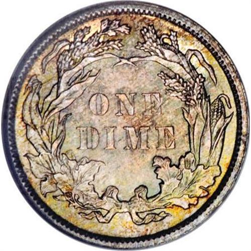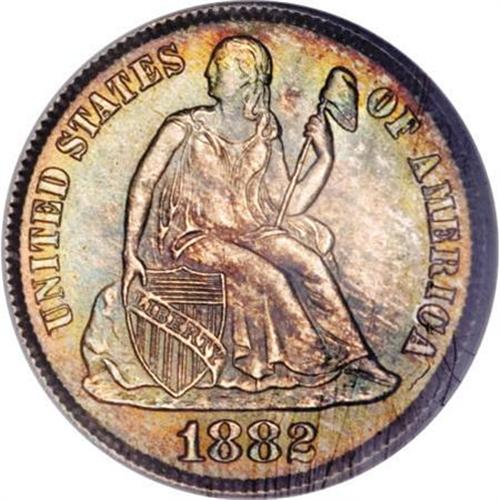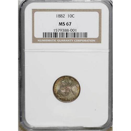 <B>1882 10C MS67 NGC.</B></I> An exceptional coin with bright, swirling luster that is covered with variegated light rose, sea-green, and blue toning. A bit softly struck on the head of Liberty, as usually found on this date, the other devices are fully defined. A fairly common type coin with a mintage of 3.9 million pieces, and an excellent type coin. Census: 26 in 67, 2 finer (1/08).<BR><BR><B>Coin Engraver:</B> Christian Gobrecht<BR><BR><b>Shipping:</b> Coins & Currency (<a target="_blank" href="http://www.heritageauctions.com/common/shipping.php">view shipping information</a>)