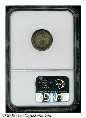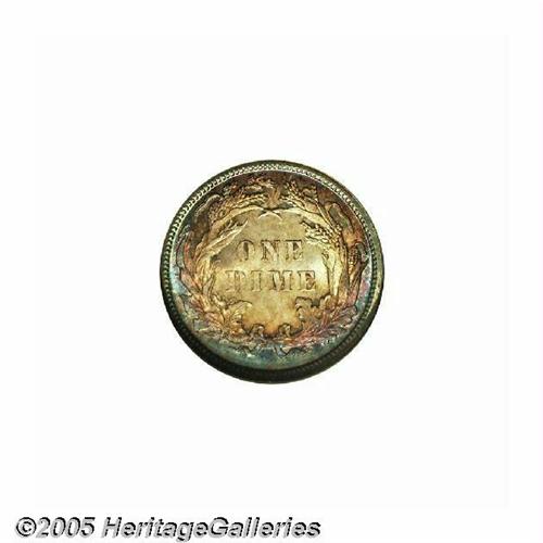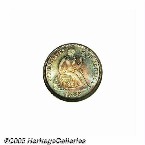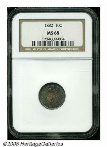 <B>1882<10C> MS68 NGC.</B></I> After reduced mintages in 1879, 1880, and 1881, the Mint began to crank out large numbers of dimes once again in 1882 with 3.9 million pieces produced in this year. This is the finest example certified at either of the major services. Close examination with a loupe shows that the surfaces are as close to technical perfection as any Seated dime we can remember having seen of any date. Additionally, both sides exhibit deep reddish-golden toning in the centers with aquamarine patina encircling the margins. Just outstanding technical quality and visual appeal. Population: 2 in 68, 0 finer (6/05).