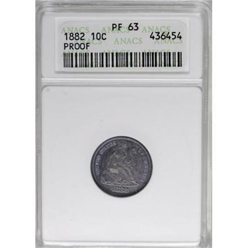 <B>1882 10C PR63 ANACS.</B></I> The design motifs are crisply struck, as expected for a proof specimen, with only slight weakness observed on Liberty's hair detail. Both sides show a deep coating of opaque olive-drab and blue patina. A couple of tiny handling marks are noted on the lower reverse. Only 1,100 pieces were originally produced. <BR><BR><B>Coin Engraver:</B> Christian Gobrecht<BR><BR><b>Shipping:</b> Coins & Currency (<a target="_blank" href="http://www.heritageauctions.com/common/shipping.php">view shipping information</a>)