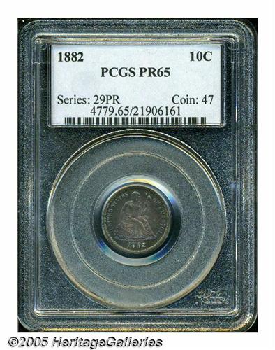 <B>1882<10C> PR65 PCGS.</B></I> Deeply toned in emerald-green and mauve-violet colors. A pinpoint-sharp specimen without noticeable contact. Traces of ivory debris are noted within the date digits.