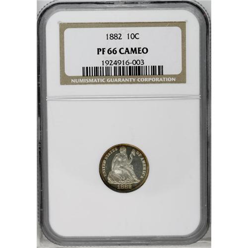 <B>1882<10C> PR66 Cameo NGC.</B></I> A bright silver Cameo example with excellent contrast. Pale gold toning is limited to the extreme border of the obverse and encroaches upon the lettering on the reverse. An aesthetically appealing Premium Gem example that is sure to delight the connoisseur.