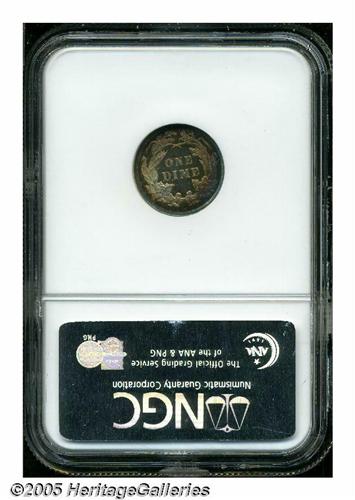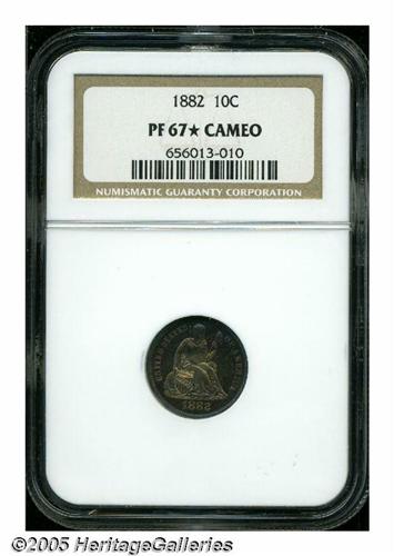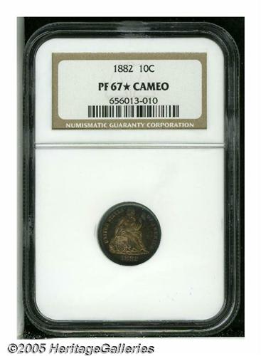 1882 10C PR67 S Cameo NGC. Mauve-red, electric-bl