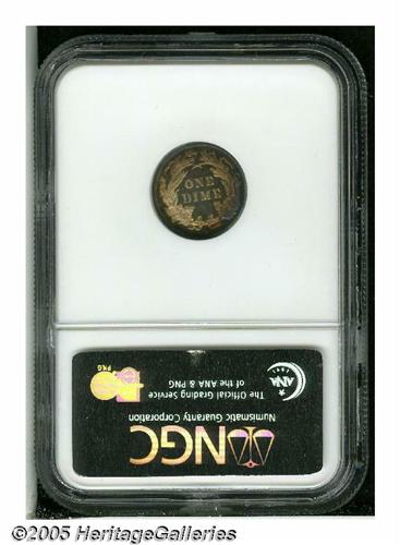 <B>1882<10C> PR67 <S Cameo NGC.</B></I> Mauve-red, electric-blue, and orange colors dominate this vividly toned Superb Gem. Meticulously struck, and Cameo frost is undeniable despite the dramatic toning. Both sides have an unbroken wire rim. A gorgeous proof type coin, meritorious of an outstanding collection.