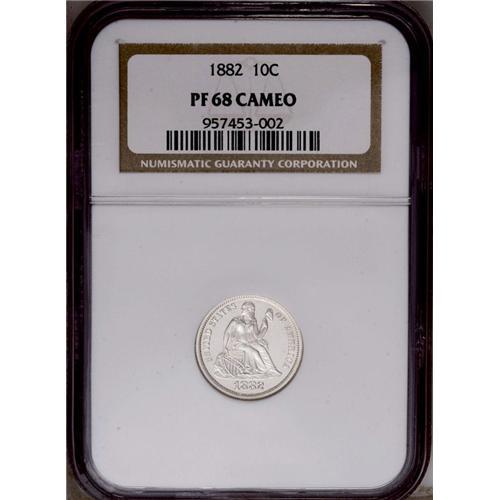 <B>1882<10C> PR68 Cameo NGC.</B></I> A magnificent icy-white specimen that looks essentially as it did when it came off the dies. The placid mirrored fields stand out in bold contrast to heavily frosted, boldly executed design elements. Close scrutiny with a glass does not even reveal a mark for pedigree purposes. The search for the ultimate untoned Legend Obverse proof dime ends here. Census: 3 in 68, 0 finer (4/06).