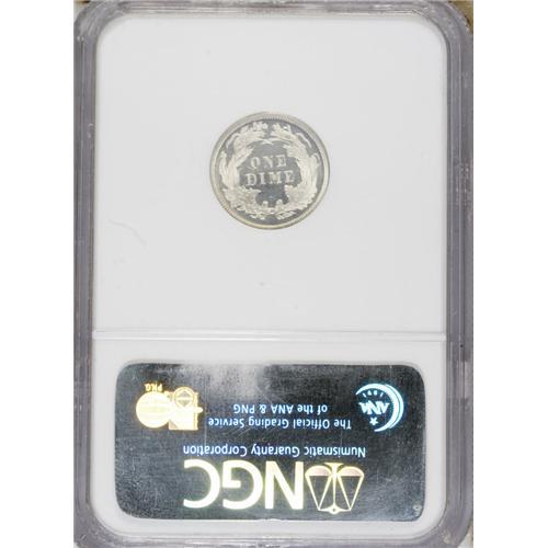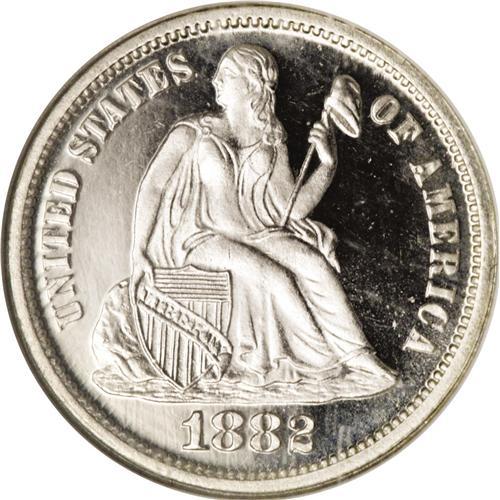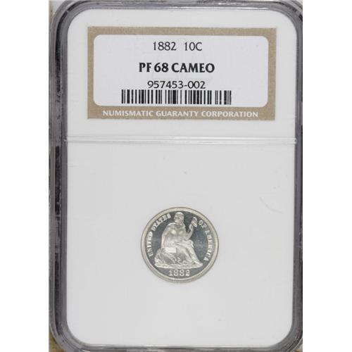 <B>1882 10C PR68 Cameo NGC.</B></I> A magnificent icy-white specimen that looks essentially as it did when it came off the dies. The placid mirrored fields stand out in bold contrast to heavily frosted, boldly executed design elements. Close scrutiny with a glass does not even reveal a mark for pedigree purposes. The search for the ultimate untoned Legend Obverse proof dime ends here. Census: 3 in 68 Cameo, 0 finer (3/07).<BR><BR><b>Shipping:</b> Coins & Currency (<a target="_blank" href="http://www.heritageauctions.com/common/shipping.php">view shipping information</a>)