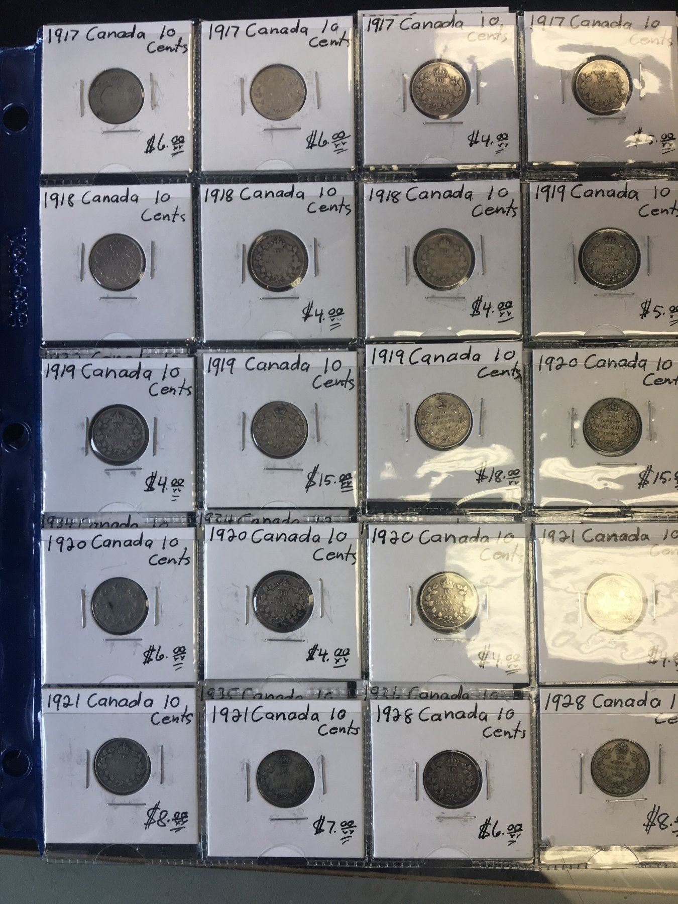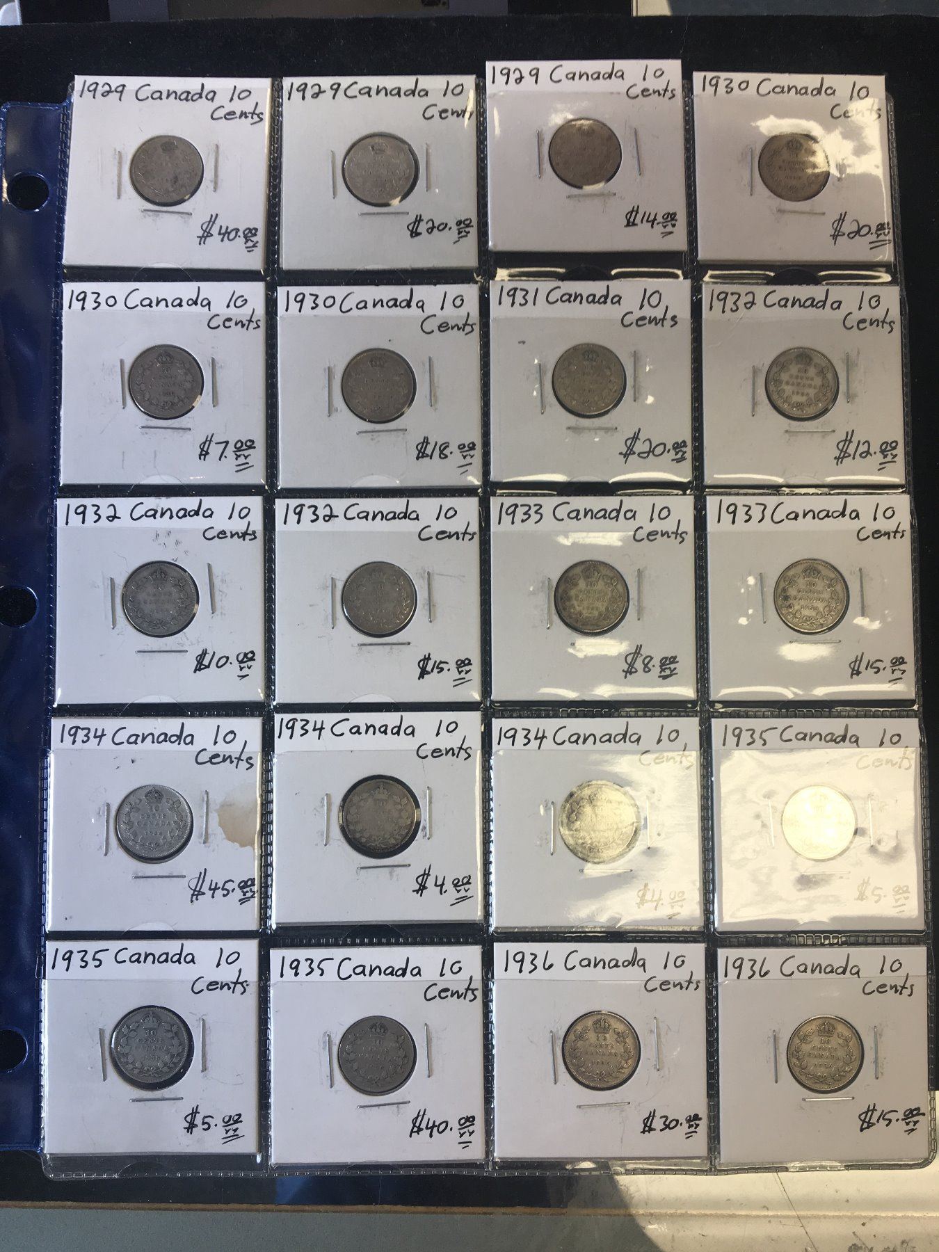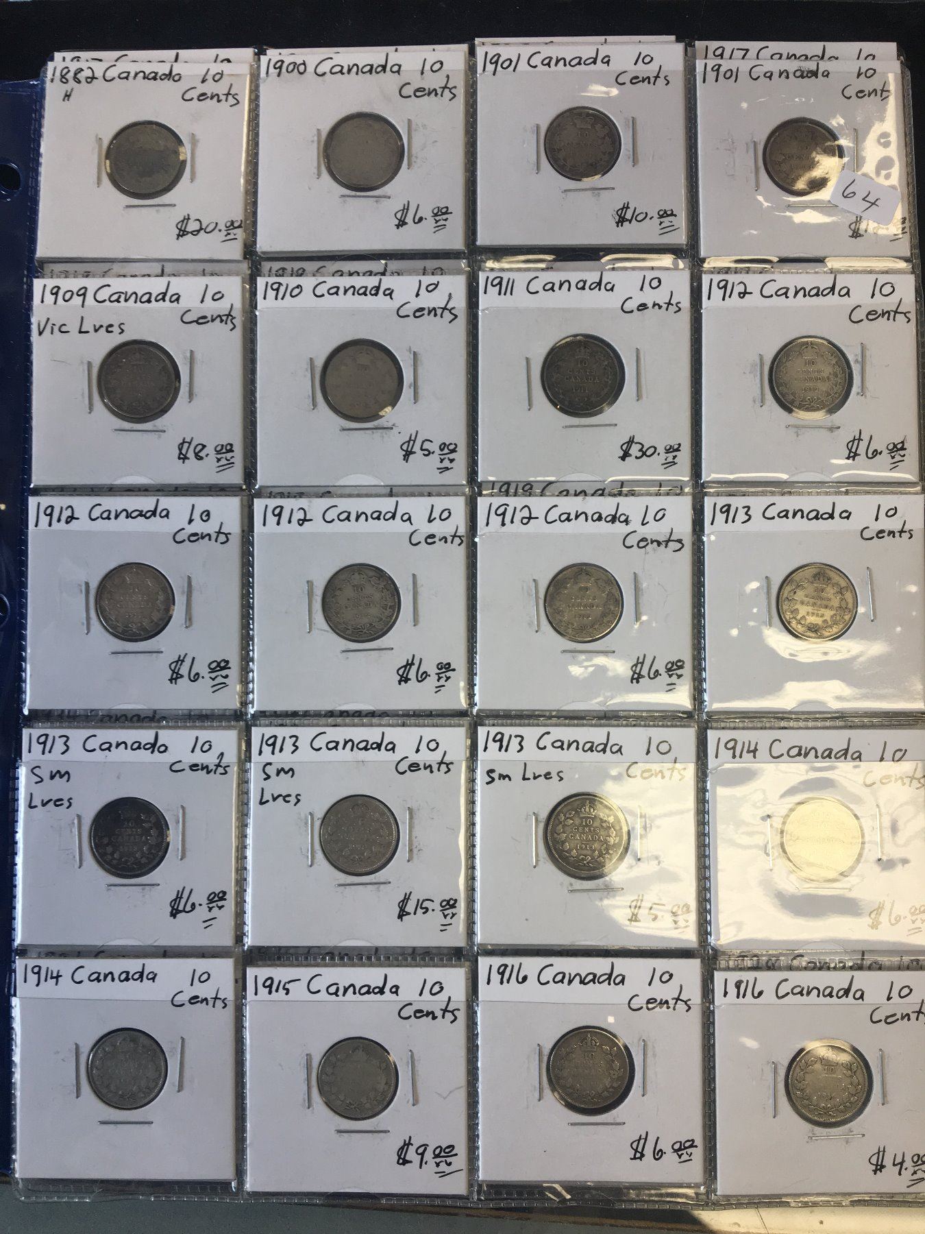 NICE LOT OF 60 CANADA 10 CENT COINS..MIXED DATES,INCLUDES 1882H,1900,1901X2 FOR VICKIES!COMPLETE DATES FROM 1909-1936 WITH DUPLICATES