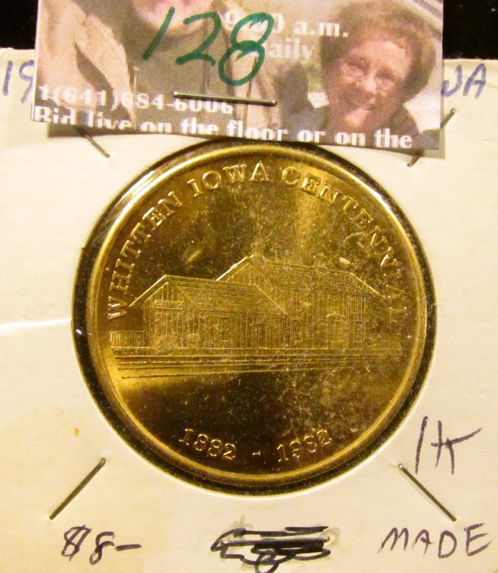 1882-1982 Whitten, Iowa Centennial Brass Medal, 39mm, BU.