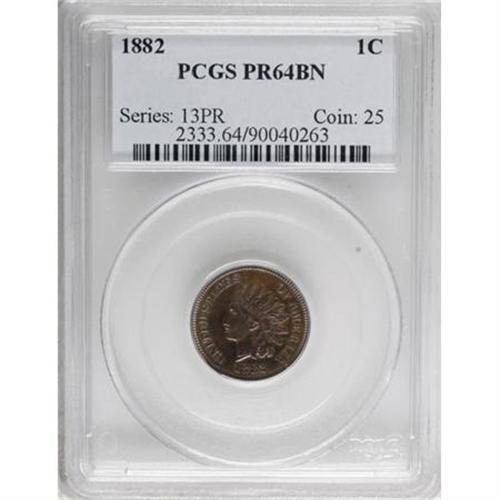 <B>1882 1C PR64 Brown PCGS.</B></I> PCGS Population (36/68). NGC Census: (37/85). Mintage: 3,100. Numismedia Wsl. Price for NGC/PCGS coin in PR64: $144. (#2333)<BR><BR><B>Coin Engraver:</B> James B. Longacre<BR><BR><b>Shipping:</b> Coins & Currency (<a target="_blank" href="http://www.heritageauctions.com/common/shipping.php">view shipping information</a>\)