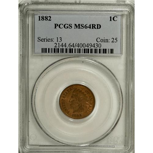 <B>1882 1C MS64 Red PCGS.</B></I> PCGS Population (95/90). NGC Census: (32/27). Mintage: 38,581,100. Numismedia Wsl. Price for NGC/PCGS coin in MS64: $276. (#2144)<BR><BR><b>Shipping:</b> Coins & Currency (<a target="_blank" href="http://www.heritageauctions.com/common/shipping.php">view shipping information</a>)