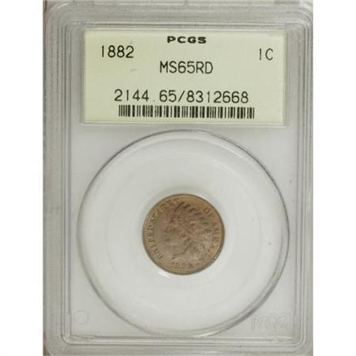<B>1882 1C MS65 Red PCGS.</B></I> The vivid rose-orange centers fade into yellow-green hues at the peripheries. Solidly struck save for slight softness on the diamonds and adjacent lower hair. A few tiny, scattered flyspecks are found in the fields of the lower obverse, but these are minor in context. PCGS has graded 22 finer Red examples (12/07).<BR><BR><B>Coin Engraver:</B> James B. Longacre<BR><BR><b>Shipping:</b> Coins & Currency (<a target="_blank" href="http://www.heritageauctions.com/common/shipping.php">view shipping information</a>)