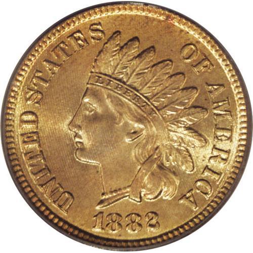 <B>1882<1C> MS66 Red PCGS.</B></I> Vivid chartreuse-gold toning illuminates the obverse, with faint peach accents in the fields, while the reverse is predominantly orange-red. The striking details are crisp and, while a handful of flyspecks are evident, there are no bothersome handling marks on either side. Certified in a green-label holder. Population: 19 in 66 Red, 2 finer (9/06).
