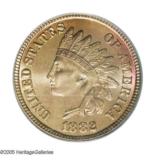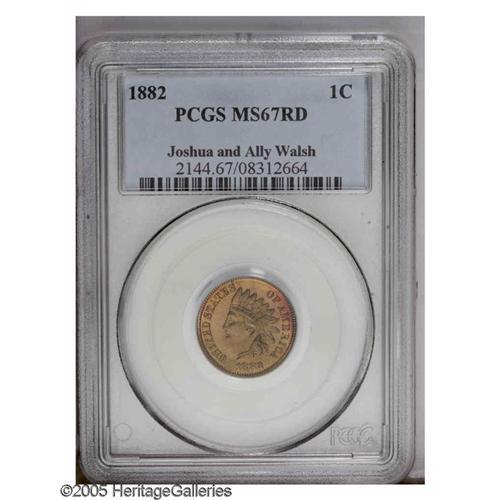 <B>1882<1C> MS67 Red PCGS. Eagle Eye Photo Seal, Card Included.</B></I> Olive-gold centers are bounded by fire-red hues. Potent cartwheel luster sweeps across the unabraded surfaces, which are pristine aside from the most minute carbon flecks. A hint of lilac color is noted above the second S in STATES. The strike is very sharp, since only the top outline of the shield exhibits any indication of incompleteness of definition. Certified in a prior generation PCGS holder. The 1882 is scarce in full Red, even in MS64 and lower grades, since time has mellowed the original color of most Uncirculated survivors. It is remarkable for an example to combine full Red color with abrasion-free preservation. As of (10/05), tied with one other PCGS example as the finest certified, since NGC has not encapsulated any pieces above MS66 Red.<BR><I>From The Joshua and Ally Walsh Collection of United States Cents.</B></I>