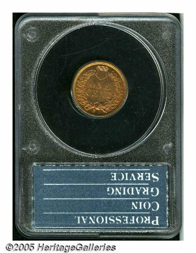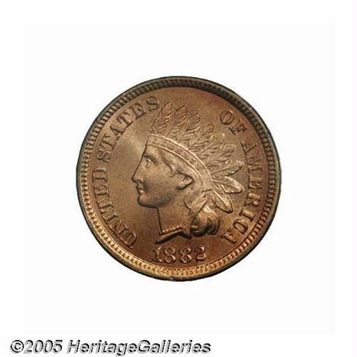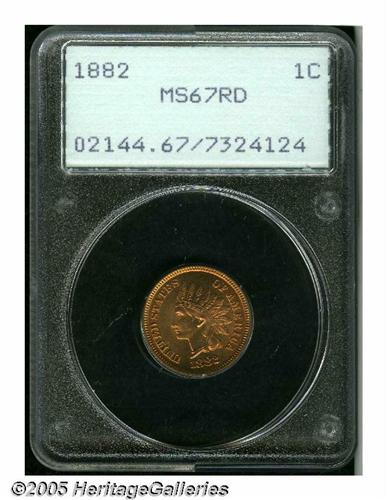<B>1882<1C> MS67 Red PCGS.</B></I> Simply extraordinary quality for a business strike Indian Cent, both sides are alive with fulsome, orange-red luster that is fully original throughout. Close examination reveals the conspicuous absence of carbon spotting so common to these coins, and the strike is razor sharp overall, including the often soft feather tips. A couple of microscopic abrasions are noted on the obverse portrait, but these do not detract and are only visible with magnification. While generally available in lower Mint State grades even up to MS65, MS66s are very scarce, and currently, only two Superb examples are known to PCGS. NGC has not graded any above MS66 (6/05). Housed in an early PCGS holder.