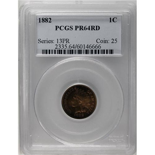 <B>1882<1C> PR64 Red PCGS. Eagle Eye Photo Seal.</B></I> Beautiful cherry-red and olive hues alternate across this satiny and intricately struck near-Gem. Only a slender portion of the mintage has retained full Red color. Population: 27 in 64, 30 finer (6/06).<BR><I>From The Empire Tree Collection, Part Two.</B></I>