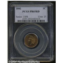 <B>1882<1C> PR65 Red PCGS.</B></I> Seemingly a conservatively graded proof Indian cent, this piece reveals no significant distractions when viewed with a loupe. The surfaces are mildly reflective and have traces of well blended crimson coloration seen on the obverse and reverse surfaces. A difficult coin to locate in finer conditions. <BR><BR><B>Important notice:</B> Heritage usually auctions material at the rate of 200-250 lots per hour. On some occasions eBay Live bid software or the Internet may not be able to keep up with the pace of the auction. We recommend placing a realistic absentee bid now as insurance to avoid disappointment. Occasionally the auctioneer may eliminate or reject an eBay Live bid, and the auctioneer may also reopen a lot after the close of the eBay live bidding (usually because we missed an audience bid), and may reject your bid even if it shows you as the winning bidder. By bidding via eBay Live, you agree that Heritage may award the lot to another bidder at its sole discretion under the circumstances described above or any other reasonable circumstances. Since eBay bids are not shown to us until we open the lot on the floor, we treat those bids just like floor bids. In most cases the floor responds before the eBay bid is presented to us, due to Internet lag time, so for consistency we have made it a policy that floor bids are always considered first over tie eBay live bids. Also please note that all Heritage lots purchased through eBay Live carry a 20% Buyer's Premium. Please make sure you read the Terms and Conditions before you bid. </span></font></tr></table></td></tr></table>
