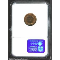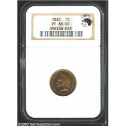 1882 1C PR66 Red NGC. Lovely yellow-gold color dominates both sides, with a solitary blush of champagne-rose iridescence within the left obverse field. The shield lines and headdress feathers have exquisite definition, while the outlines of the wreath are needle-sharp. The surfaces are seemingly pristine, and the only carbon fleck located under the most intense scrutiny hides below the right serif of the T in CENT. Population: 1 in 66, 0 finer (11/02).From the "Newmismatist" Collection. Important notice: We expect to be auctioning lots at the rate of 200-250 per hour. Sometimes eBay Premier live bid software cannot keep up with that pace, so we strongly recommend that you place a realistic proxy bid now as insurance to avoid disappointment. Also please note that all Heritage/CAA lots purchased through eBay Premier carry a 20% Buyer's Premium. Please make sure you read the Terms and Conditions.
