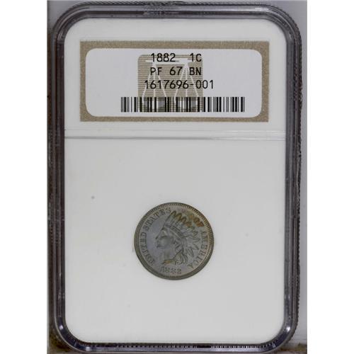 <B>1882<1C> PR67 Brown NGC.</B></I> The rich violet-brown color in the fields is contrasted against bright electric-blue, rose, and gold toning over the central devices. Sharply struck and contact-free, this masterfully preserved Superb Gem is conditionally scarce at this grade level, as expected. Census: 5 in 67, 0 finer (3/06). <BR><BR><B>Important notice:</B> Heritage usually auctions material at the rate of 200-250 lots per hour. On some occasions eBay Live bid software or the Internet may not be able to keep up with the pace of the auction. We recommend placing a realistic absentee bid now as insurance to avoid disappointment. Occasionally the auctioneer may eliminate or reject an eBay Live bid, and the auctioneer may also reopen a lot after the close of the eBay live bidding (usually because we missed an audience bid), and may reject your bid even if it shows you as the winning bidder. By bidding via eBay Live, you agree that Heritage may award the lot to another bidder at its sole discretion under the circumstances described above or any other reasonable circumstances. Since eBay bids are not shown to us until we open the lot on the floor, we treat those bids just like floor bids. In most cases the floor responds before the eBay bid is presented to us, due to Internet lag time, so for consistency we have made it a policy that floor bids are always considered first over tie eBay live bids. Also please note that all Heritage lots purchased through eBay Live carry a 20% Buyer's Premium. Please make sure you read the Terms and Conditions before you bid. This lot is being auctioned in conjunction with a live floor auction by Heritage Galleries & Auctioneers. All final auction and invoice information will be supplied by Heritage Galleries & Auctioneers, and all other information should be considered preliminary. Lot:443 <BR><BR><B>Winning Notification and Billing:</B> After the FINAL session in this auction is complete, Heritage will send e-mail and snail mail invoices. This process normally takes several days. All final auction and invoice information will be supplied by Heritage Galleries & Auctioneers, and all other information should be considered preliminary. <BR><BR>This auction will be conducted on a live auction floor and over the Internet through eBay Live. If you choose to place an absentee bid, please take a moment to <font color='#0000ff'><u><a href='http://pages.ebay.com/liveauctions/help/before/laabsentee.html'>learn how eBay Live absentee bidding works</a></u></font><font color='#000000'>