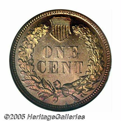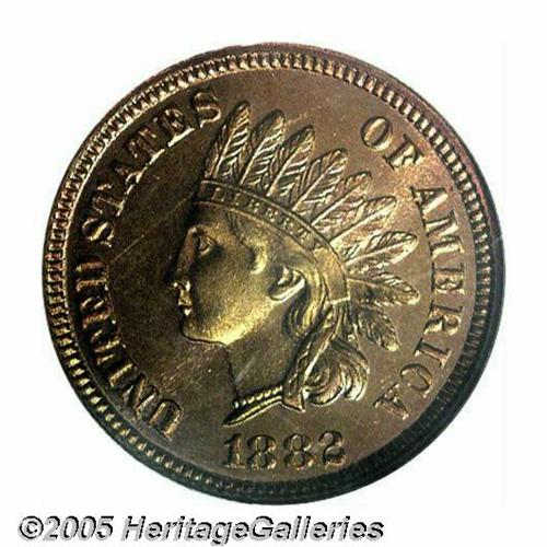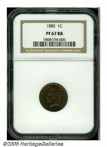 <B>1882<1C> PR67 Red and Brown NGC.</B></I> This is an absolutely outstanding proof Indian cent. The surfaces are essentially perfect and the fields deeply mirrored. While designated as a Red and Brown coin, there really is no brown present. There is, however, a noticeable accent of pale olive intermixed with the bright orange-red luster. Population: 6 in 67, 0 finer (4/05).