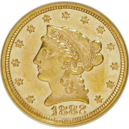 <B>1882 $2 1/2 AU58 NGC.</B></I> NGC Census: (46/75). PCGS Population (25/56). Mintage: 4,000. Numismedia Wsl. Price for NGC/PCGS coin in AU58: $479. (#7834)<BR><BR><B>Coin Engraver:</B> Christian Gobrecht<BR><BR><b>Shipping:</b> Coins & Currency (<a target="_blank" href="http://www.heritageauctions.com/common/shipping.php">view shipping information</a>\)