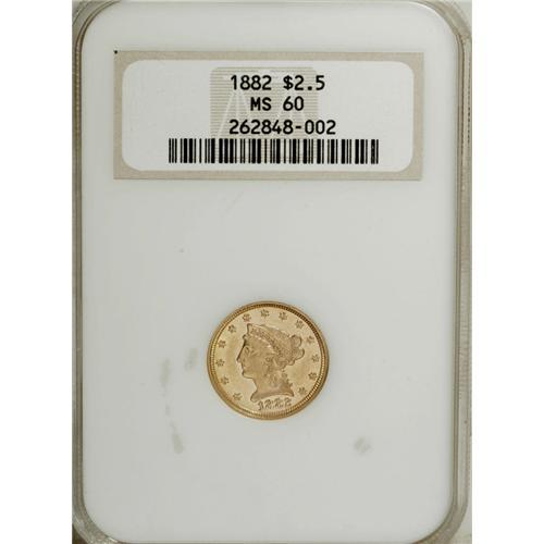 <B>1882 $2 1/2 MS60 NGC.</B></I> An exactingly struck and flashy piece with pleasing preservation despite a few thin marks near the date and hair bun. A mere 4,000 pieces were struck for this elusive yet unheralded issue. Housed in a prior generation NGC holder.<BR><BR><b>Shipping:</b> Coins & Currency (<a target="_blank" href="http://www.heritageauctions.com/common/shipping.php">view shipping information</a>)