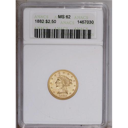 <B>1882 $2 1/2 MS62 ANACS.</B></I> This needle-sharp and flashy piece has some wispy slide marks in the fields, not unexpected for the grade. A tiny production of 4,000 business strikes ensures the scarcity.