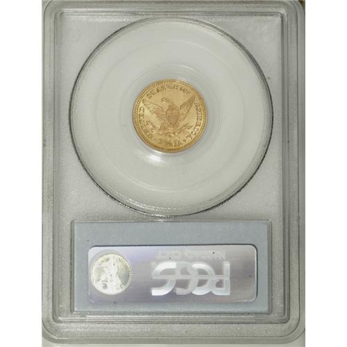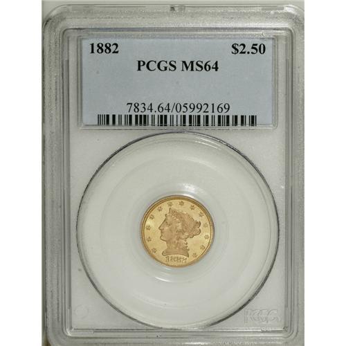 <B>1882 $2 1/2 MS64 PCGS.</B></I> Every quarter eagle produced during the 1880s is a low-mintage issue, with just 4,000 coins minted in 1882. These coins did not actually circulate widely, thus they are available in Mint State grades, although seldom at the Choice or Gem grade levels. This piece is fully detailed with mirrored surfaces and lustrous devices. Rich yellow-gold color is accented by pale rose toning on the devices. Population: 13 in 64, 9 finer (1/07).<BR><BR><b>Shipping:</b> Coins & Currency (<a target="_blank" href="http://www.heritageauctions.com/common/shipping.php">view shipping information</a>)